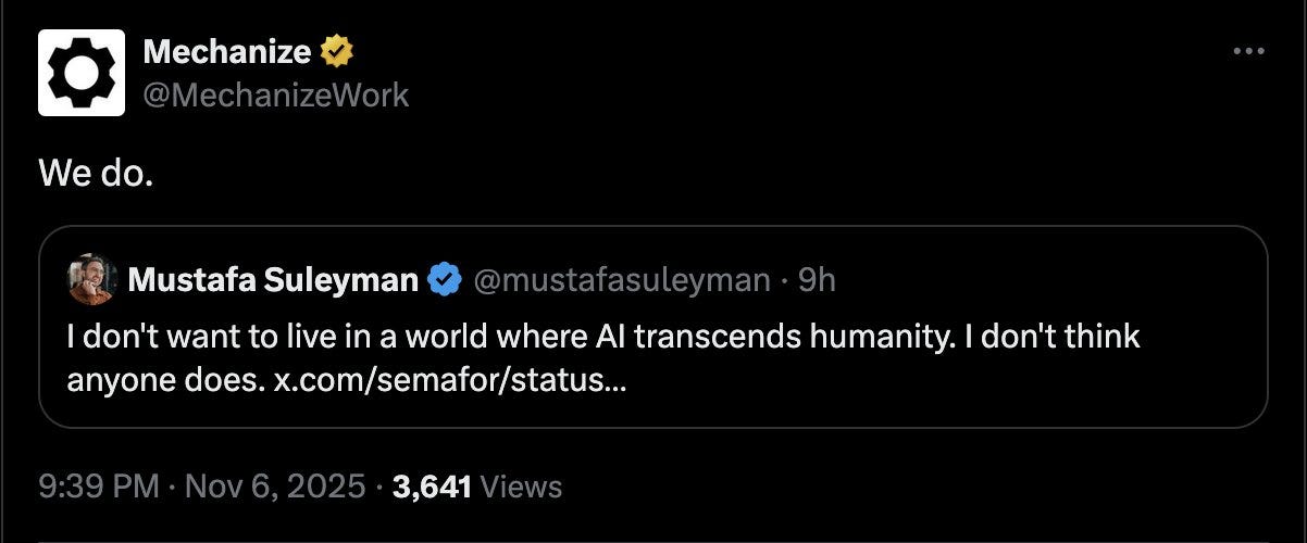 Mechanize, a startup creating RL environments (simulated playgrounds for AI agents to train in), doesn’t go for the splashy ads. They prefer plaintext blog posts, tweeted out as screenshots. “Little can stop the inexorable march towards the full automation of the economy. We should be glad,” one essay concludes. Are they true believers in full automation? Probably. But other incentives are in the mix. There are a million startups creating RL environments, recruiting is really hard, and hot takes are one reliable way to stand above the fray.