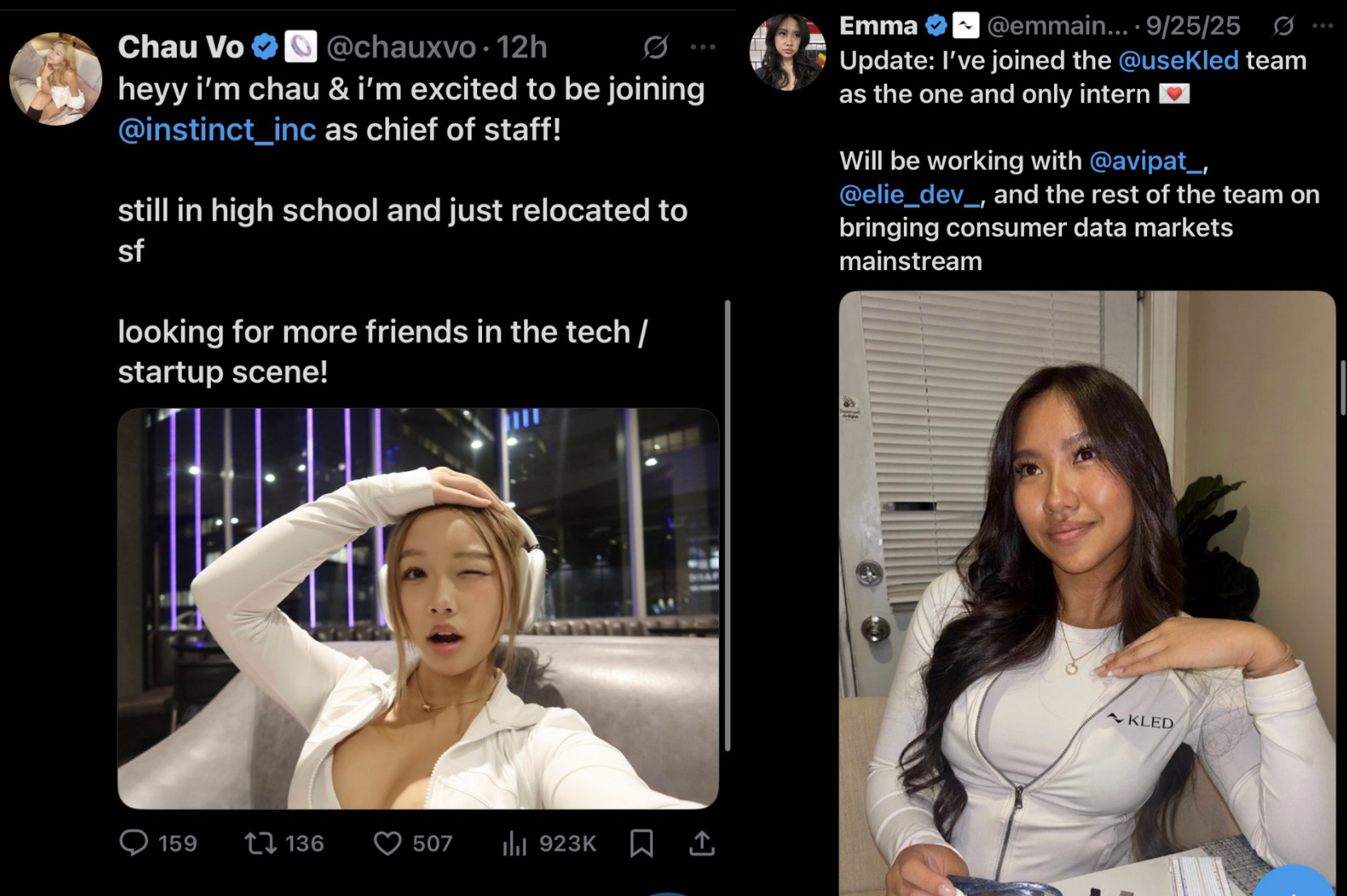 The viral trend that made me saddest involved young women tweeting thirst traps to announce that they just joined a startup and were looking to make friends in tech. Most were Asian and looked between the ages of 17 and 24, taking smizing selfies in skintight clothes. I think women can post whatever on their personal accounts, but trading looks for lead-gen (on “consumer data marketplaces,” of all things) is a losing game.